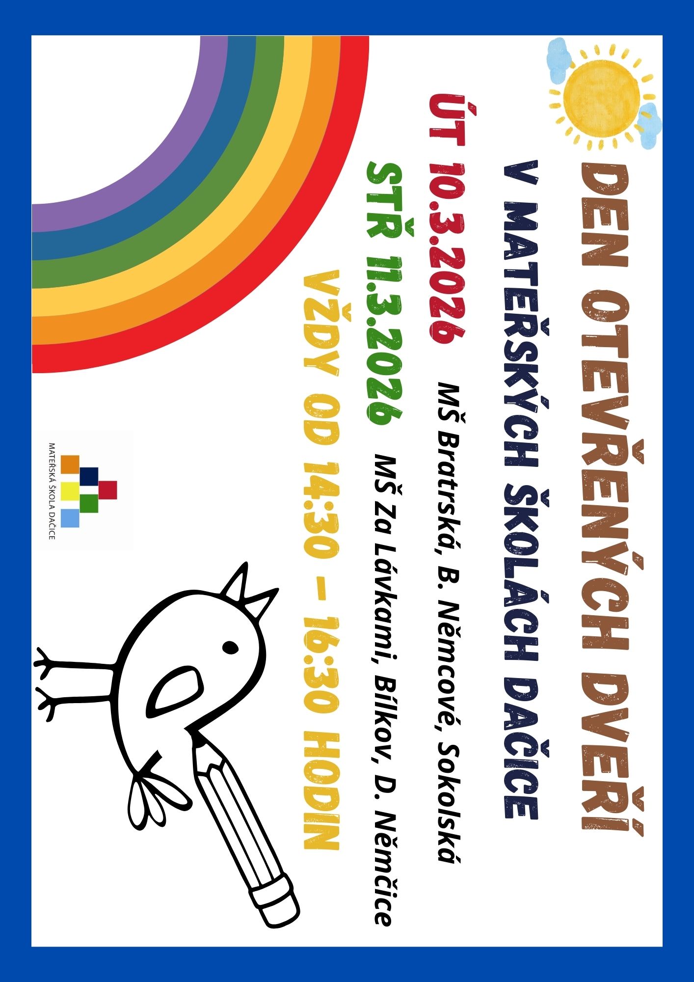 Srdečně vás zveme na prohlídku našich mateřských škol ve dnech 10. a 11. března 2026, vždy od 14:30 - 16:30 hod
