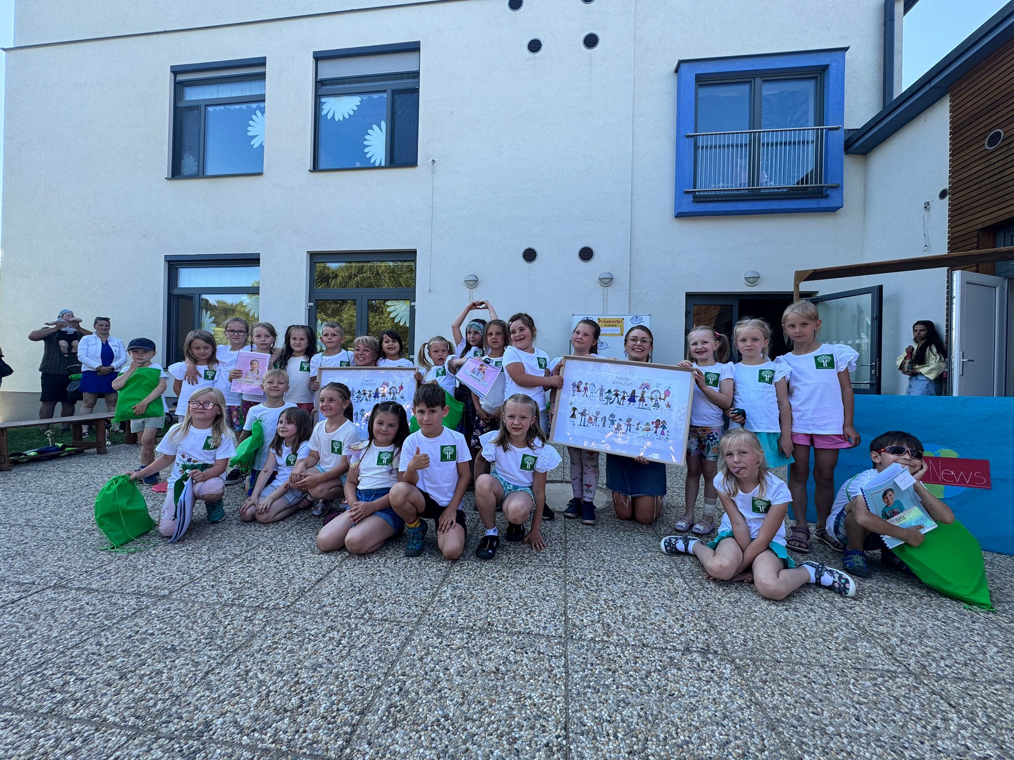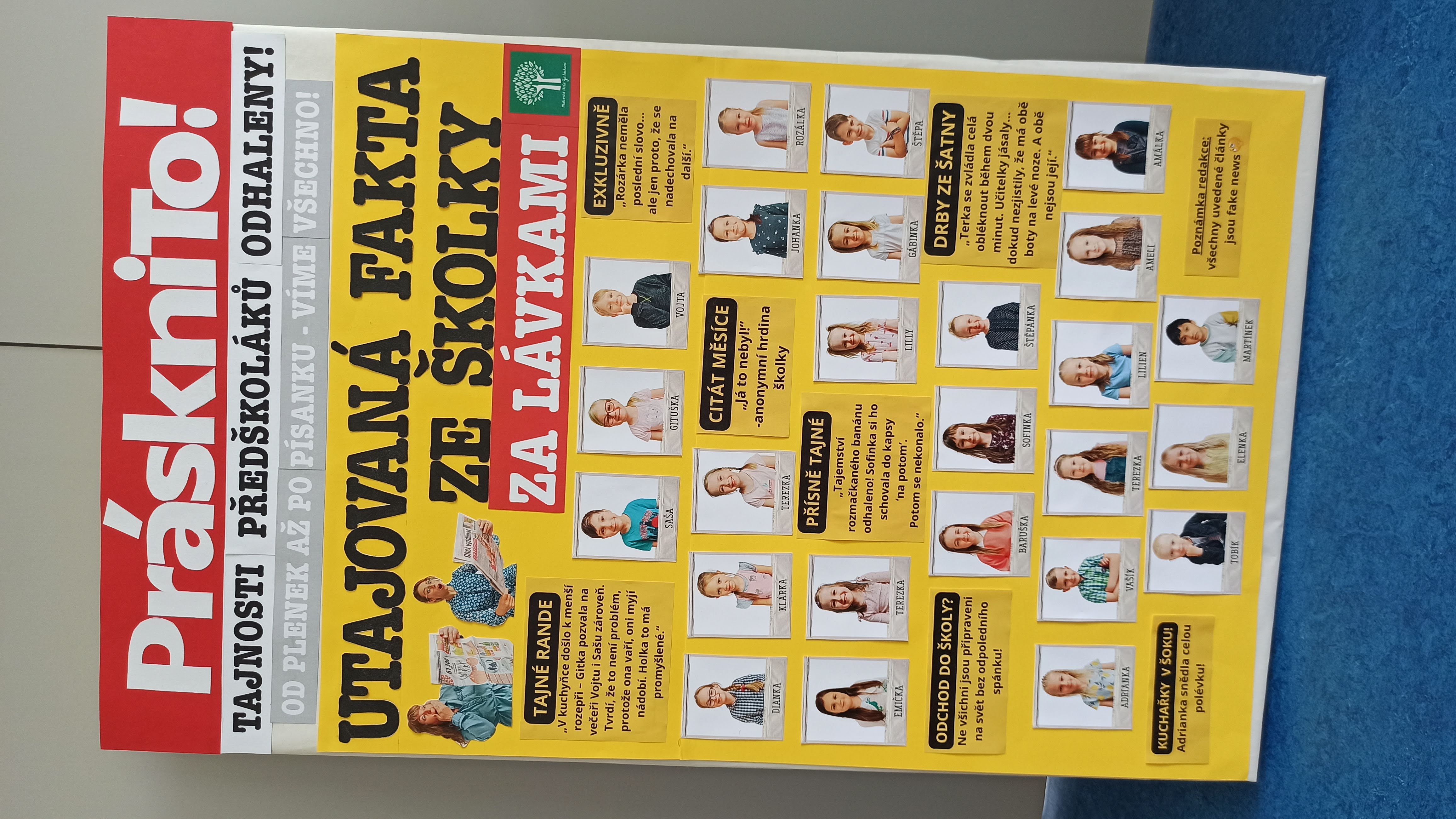 Na náměstí jsme slavnostně odhalili tablo budoucích školáků ve formě novinového bulvárního plátku "PráskniTo!". Dojemnou atmosféru završilo závěrečné video, které nám připomnělo všechny krásné okamžiky, společné akce a pokroky dětí během školního roku. Ameli společně s maminkou vytvořily nádherné animační video z našich obrázků a tak máme krásnou památku na všechny kamarády (video níže).